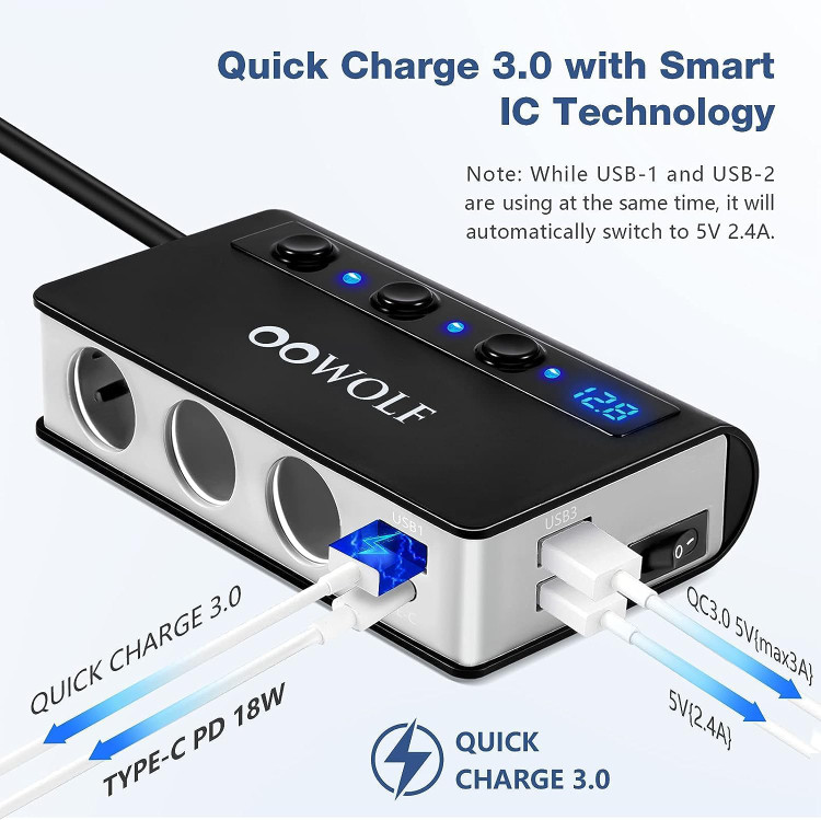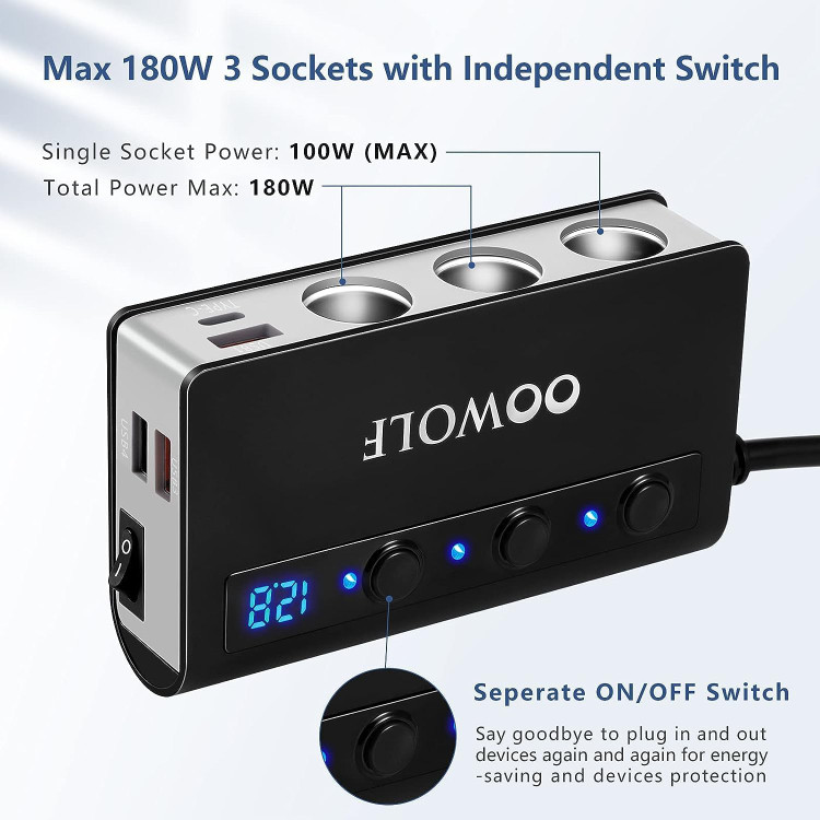 【کلید روشن/خاموش】یک کلید اصلی برای کل شارژر خودرو و 3 کلید روشن/خاموش مستقل برای هر پریز. کافیست دکمه روشن یا