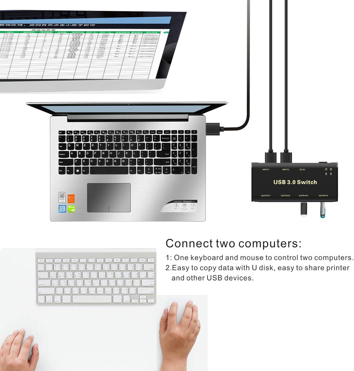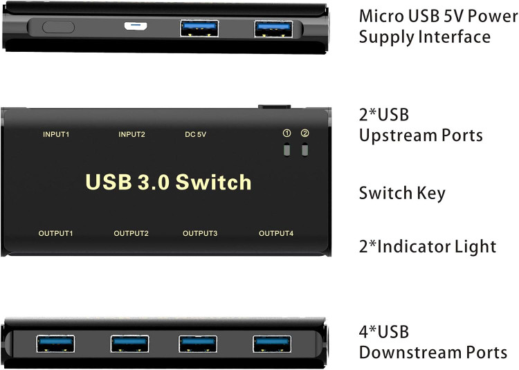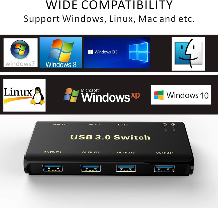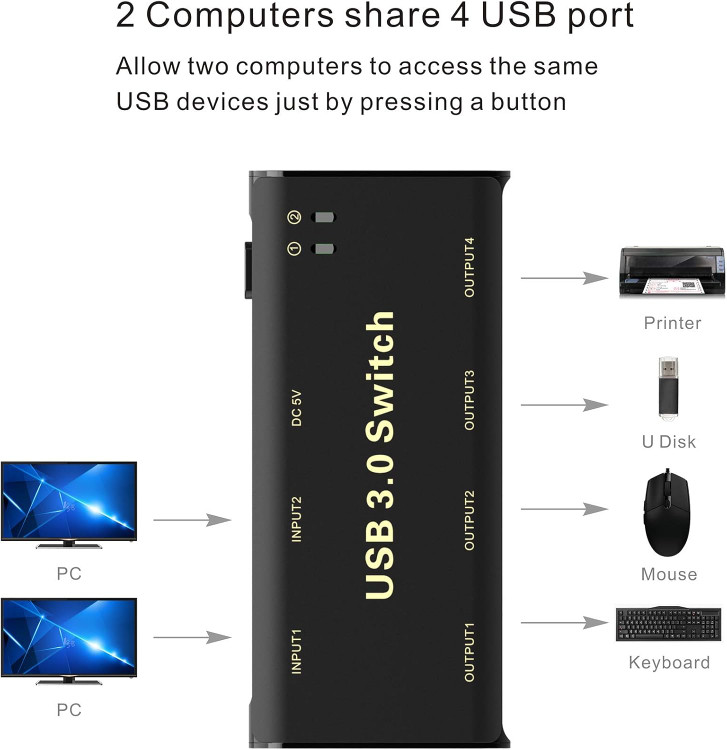 این سوئیچر 4 پورت USB 3.0 امکان جابجایی یک دکمه را بین 2 کامپیوتر برای به اشتراک گذاشتن 4 دستگاه جانبی USB 3.0 بدون کشیدن مداوم کابل یا راه اندازی نرم افزار به اشتراک گذاری شبکه پیچیده می دهد.