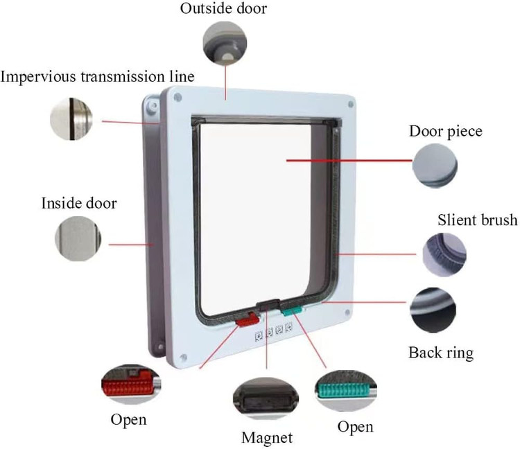 حالت سوئیچ 4 جهته --- درب حیوان خانگی را می توان با سوئیچ های قرمز و سبز با زبانه ها به 4 حالت تنظیم کرد: فقط بیرون، فقط در داخل و خارج، و کاملا قفل، کنترل آسان داخل و خارج حیوان خانگی شما.