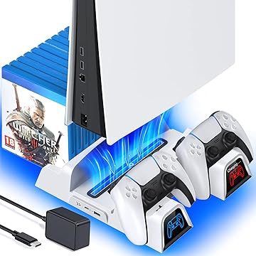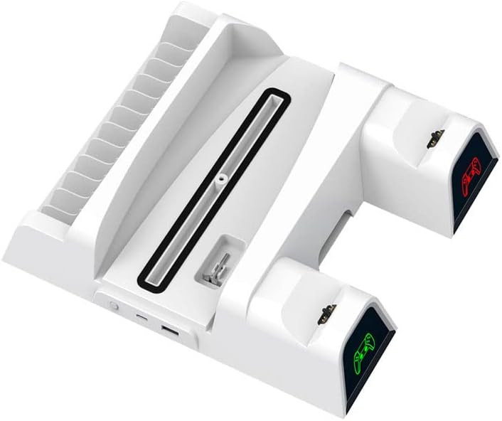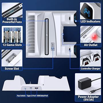 🆕 【ایستگاه داک PS5 با یک آداپتور AC سفارشی ارتقا یافته است】 با یک آداپتور 5V/3A سفارشی ارتقا یافته است تا این پایه قدرتمند PS5 را با حداکثر راندمان شارژ به سطح بالاتری برساند. دارای فنهای مکش قابل تنظیم با سه سرعت برای خنککنندگی کارآمد، دو ایستگاه شارژر کنترلر PS5 با نشانگرهای LED و 12 جایگاه بازی. این لوازم جانبی PS5 بهترین جایگزین برای ایستگاه شارژ رسمی PS5 با طراحی شیک و مرتب است.