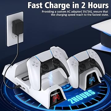 🆕【راهاندازی و شارژ آسان】هر آنچه برای راهاندازی نیاز دارید، در این بسته گنجانده شده است. پیچ را از پایه داک PS5 جدا کنید و درست مانند داک اصلی که همراه PS5 شما ارائه میشود، آن را وصل کنید. دستههای PS5 به راحتی در جایگاه شارژ قرار میگیرند و فوراً شروع به شارژ شدن میکنند. چراغهای LED شارژ به شما اطلاع میدهند که دسته شما آماده است، قرمز وقتی در حال شارژ شدن هستند و آبی وقتی آماده استفاده هستند! شارژ سریع، دستههای شما را در کمتر از 2 ساعت آماده استفاده میکند.