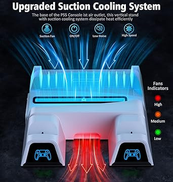 🆕 【فن خنککننده PS5 با مکش پرسرعت و 3 سرعت فن】سیستم خنککننده PS5 با 3 سطح قابل تنظیم سرعت فن ارتقا یافته است، سه چراغ مختلف نشاندهنده سرعت بالا (قرمز)، متوسط (نارنجی) و کم (سبز) هستند. علاوه بر این، پایه این پایه خنککننده PS5 از فلز ساخته شده است که به طور موثر گرما را از پایه پراکنده میکند و امکان نصب روی میز، کف یا هر سطح سخت دیگری را فراهم میکند.