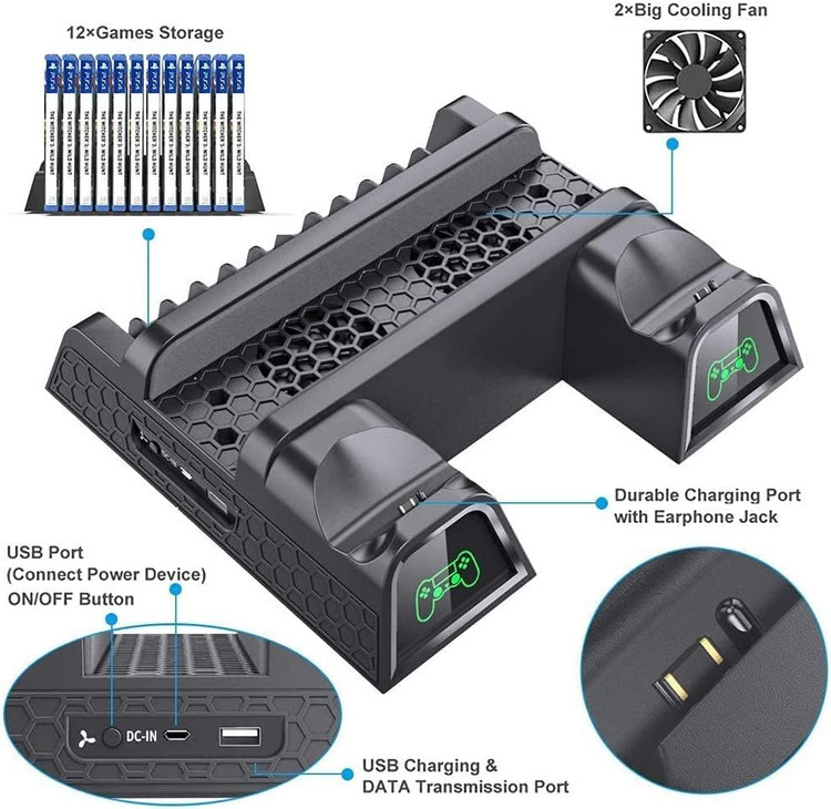 طراحی چند منظوره برای کنسول معمولی PS4 / PS4 Slim / PS4 Pro خنکسازی و ذخیرهسازی کنسول Playstation 4 شما، با ایستگاه شارژر دوگانه و 12 اسلات بازی. نشانگرهای LED و سرعت شارژ سریع: وضعیت شارژ را در یک نگاه به شما اطلاع می دهد، نشانگر قرمز به معنای شارژ شدن است، چراغ سبز به معنای تکمیل شارژ است. با دانگلهای USB خداحافظی کنید که در هنگام شارژ 4 ساعت طول میکشد، شارژ از طریق درگاه EXT فقط 2 ساعت طول میکشد. سیستم خنک کننده ارتقا یافته: فن را روشن کنید و کنسول پلی استیشن 4 خود را به طور موثر خنک کنید، نویز تا 50 دسی بل کاهش پیدا کرد، کف فلزی به شما کمک می کند تا کنسول خود را از طریق انجام بازی در تمام طول روز و شب خنک و خنک نگه دارید. سازگار با کنسول PS4/Slim/Pro: کنسول های پلی استیشن 4 خود را روی پایه خنک کننده قرار دهید، طراحی محکم تر برای PS4 Pro، بسیار قابل اعتماد برای ایمن سازی کنسول شما. (توجه: باید از نگهدارنده اضافی موجود برای PS4 slim استفاده کنید.) دستگاه های منبع تغذیه: همراه با کابل USB، پشتیبانی از دستگاه های مختلف، آداپتور USB، USB HUB، آداپتور دیواری یا کنسول پلی استیشن 4 شما.