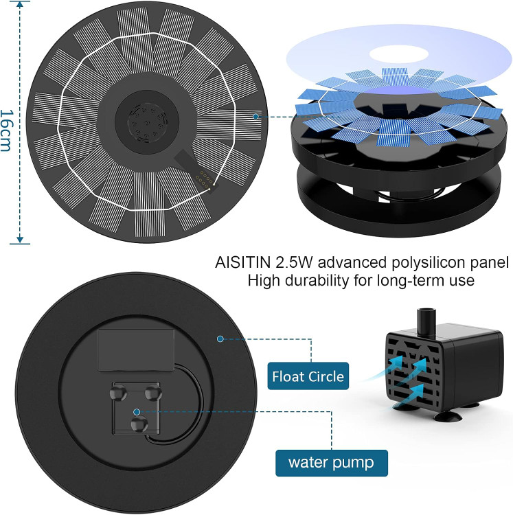 پمپ فواره حمام پرنده خورشیدی AISITIN 2.5W، پمپ فواره خورشیدی برای حمام پرنده با 6 نازل، پمپ فواره آب خورشیدی 6.7 اینچی برای باغ، استخر، ...