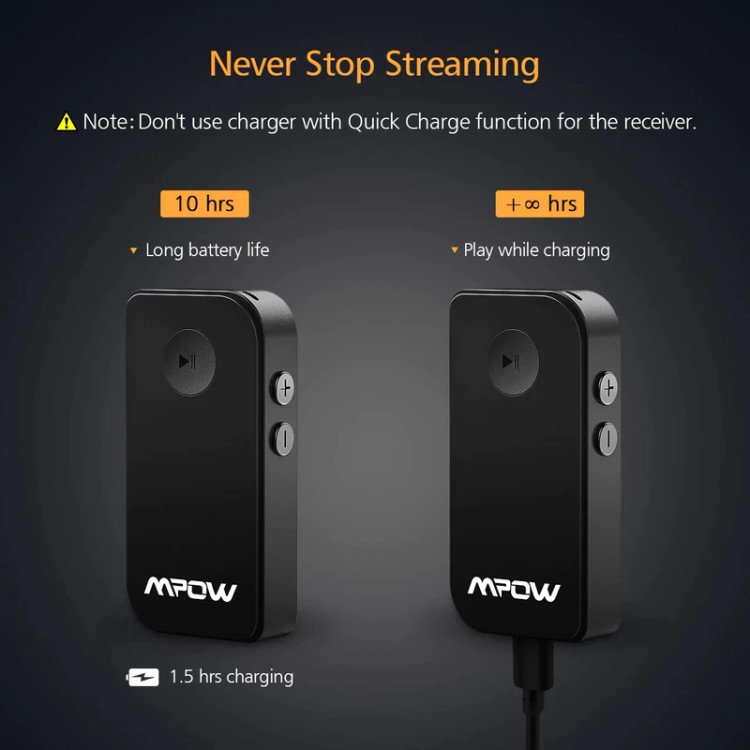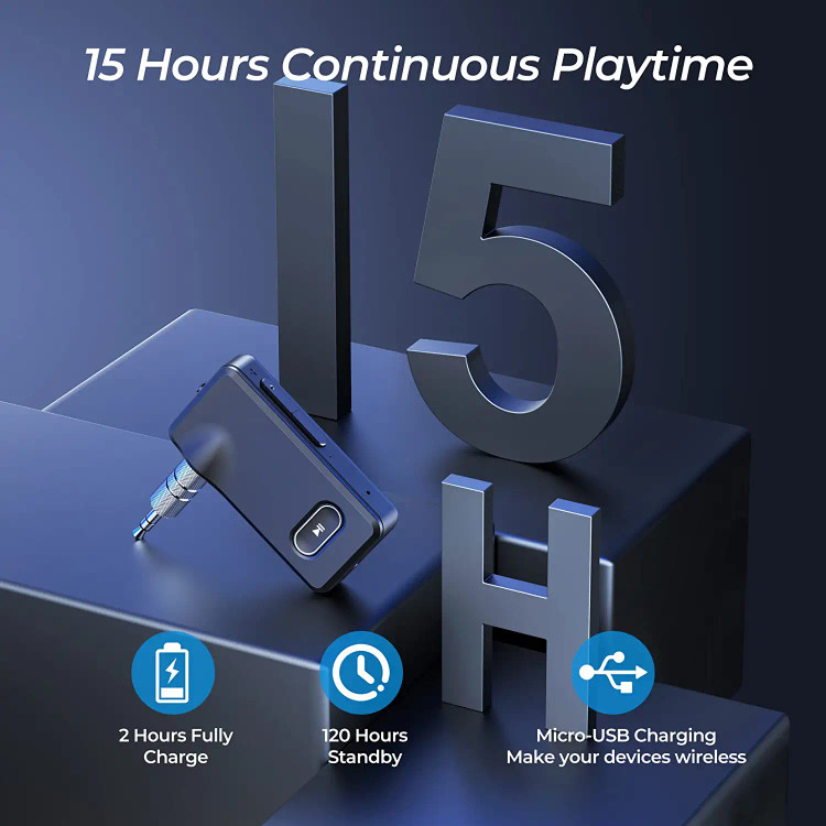 ♫۱۵ ساعت عمر باتری: میتوانید به راحتی از آداپتور بلوتوث کمکی به مدت ۱۲ ساعت با یک بار شارژ بدون هیچ مشکلی استفاده کنید. و شارژ کامل دستگاه با استفاده از کابل شارژ سریع میکرو USB (موجود در بستهبندی) تنها ۲.۵ ساعت طول میکشد.