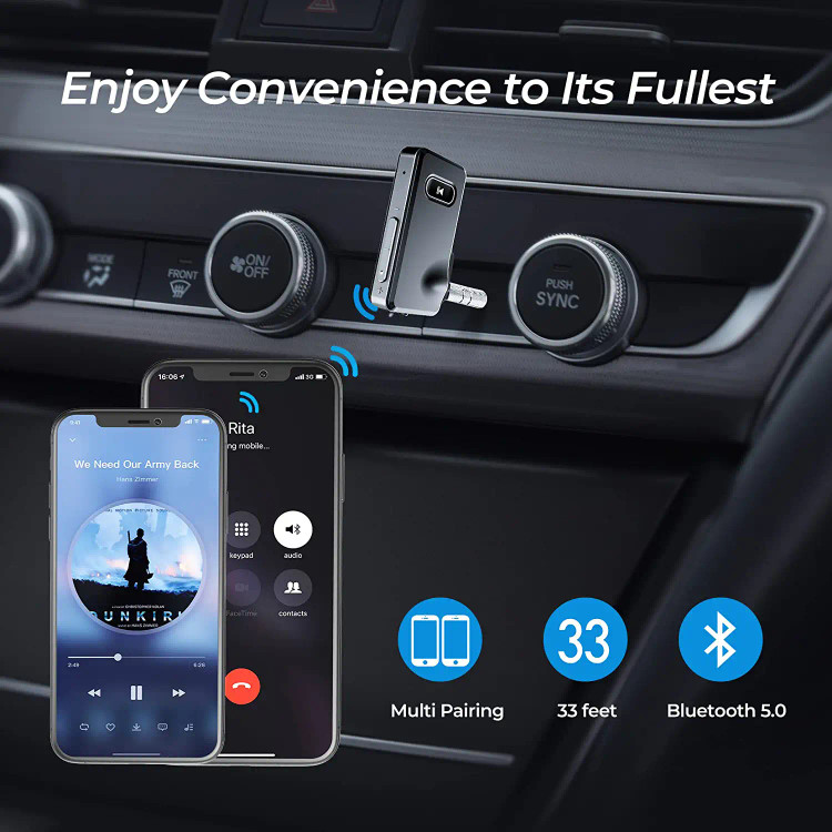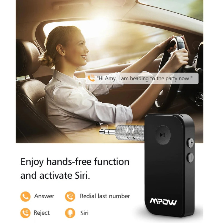 گیرنده بلوتوث Mpow 5.0، آداپتور بلوتوث بیسیم Aux، آداپتور صوتی بلوتوث قابل حمل با تماسهای هندزفری و دستیار صوتی برای سیستمهای استریوی خودرو و خانگی