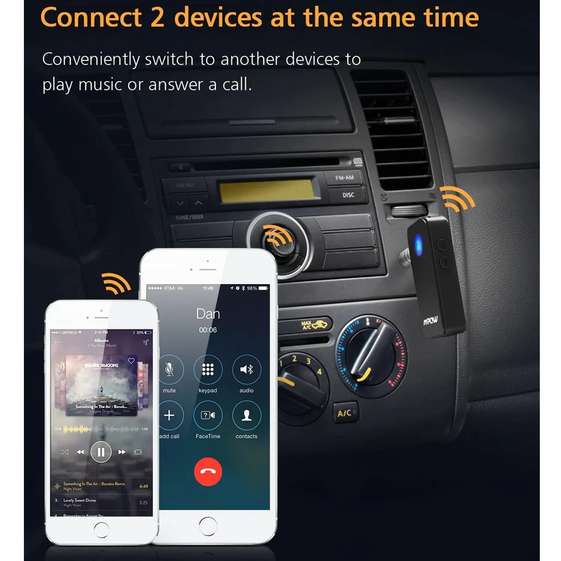 ماشین، پخش های قدیمی با کیفیت که بلوتوث ندارند_ با این وسیله میتوان هندزفی سیمی خود را بدون اتصال سیمی به گوشی به صورت وایرلس به گوشی وصل کرد، برای ناوربری در داخل ماشین برای پاسخ دادن به تماس ها و ...