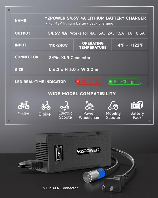 شارژر باتری لیتیومی YZPOWER 48 ولت، شارژر سریع 54.6 ولت 4 آمپر با فن خنک کننده توربو - محافظت در برابر گرمای بیش از حد، کانکتور XLR 3 پین برای دوچرخه برقی/اسکوتر/اسکوتر برقی/اسکوتر برقی/دوچرخه برقی