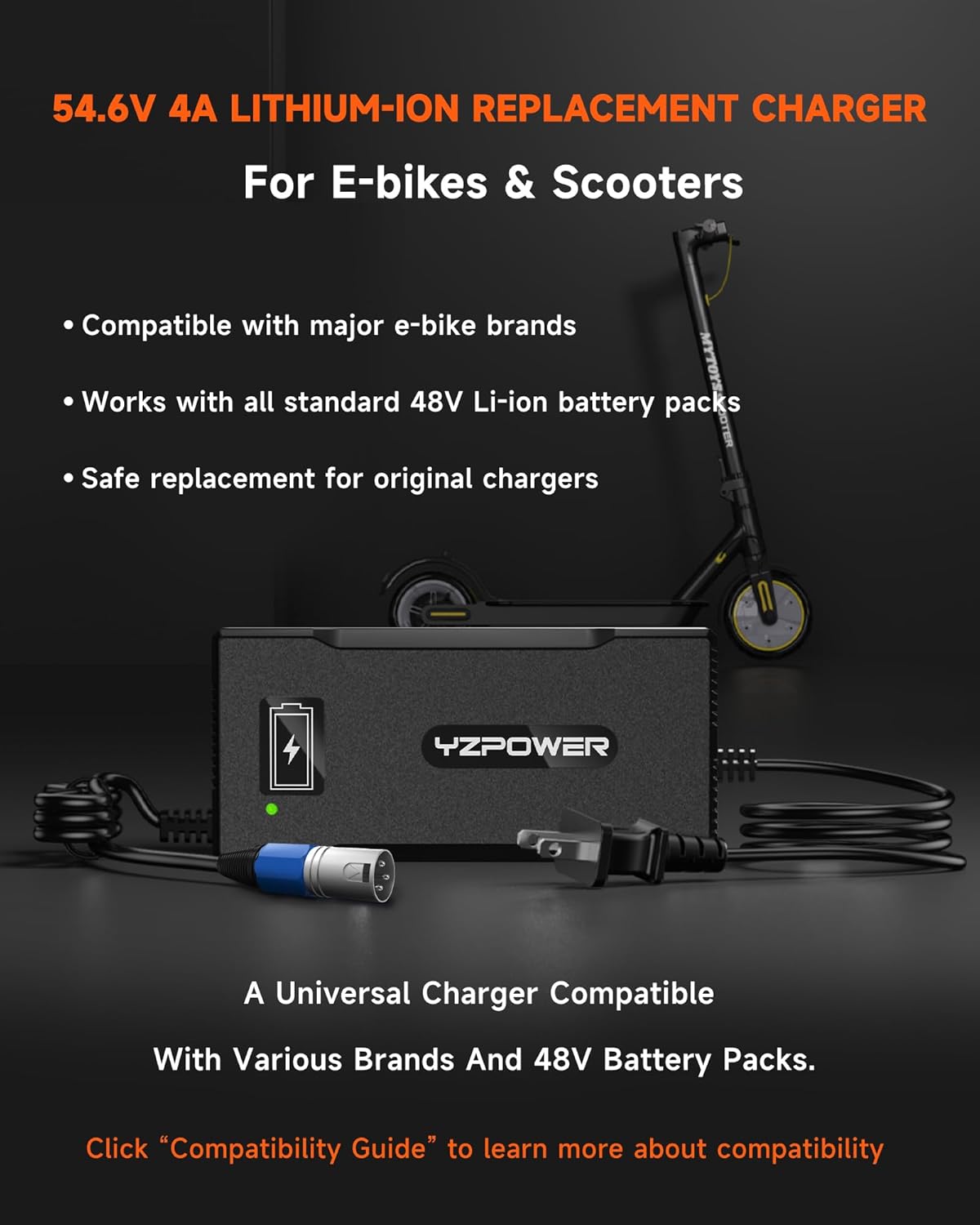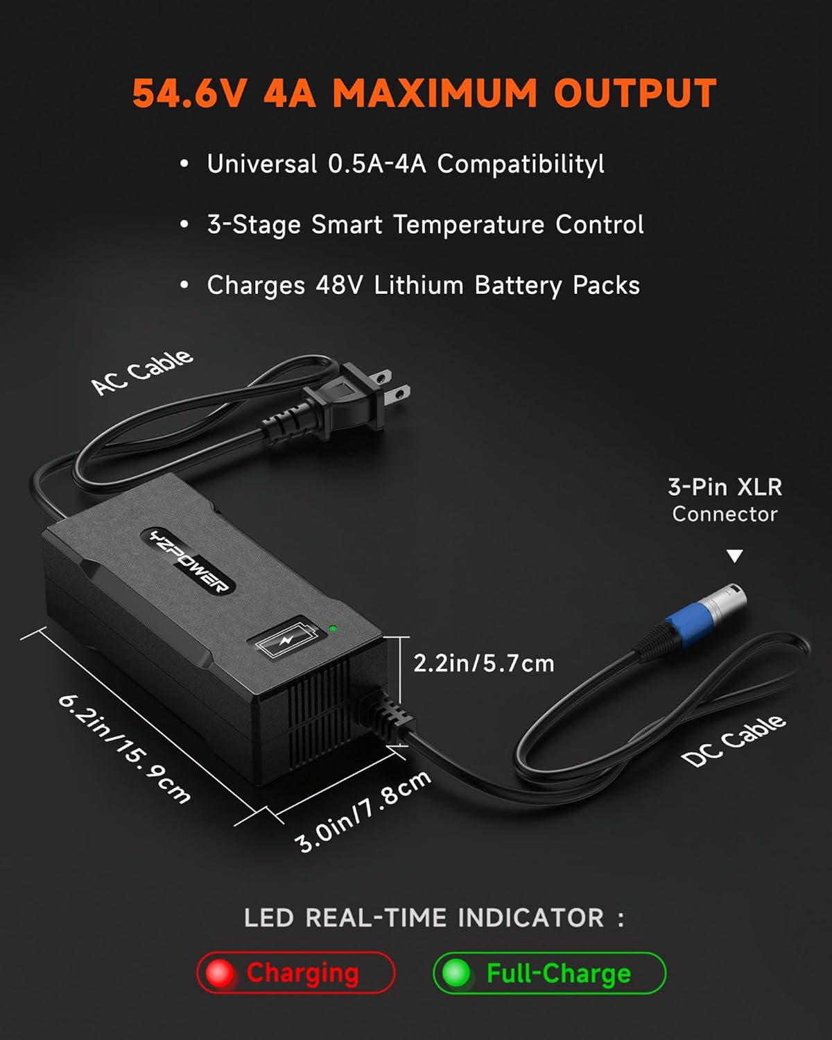 شارژر باتری لیتیومی YZPOWER 48 ولت، شارژر سریع 54.6 ولت 4 آمپر با فن خنک کننده توربو - محافظت در برابر گرمای بیش از حد، کانکتور XLR 3 پین برای دوچرخه برقی/اسکوتر/اسکوتر برقی/اسکوتر برقی/دوچرخه برقی