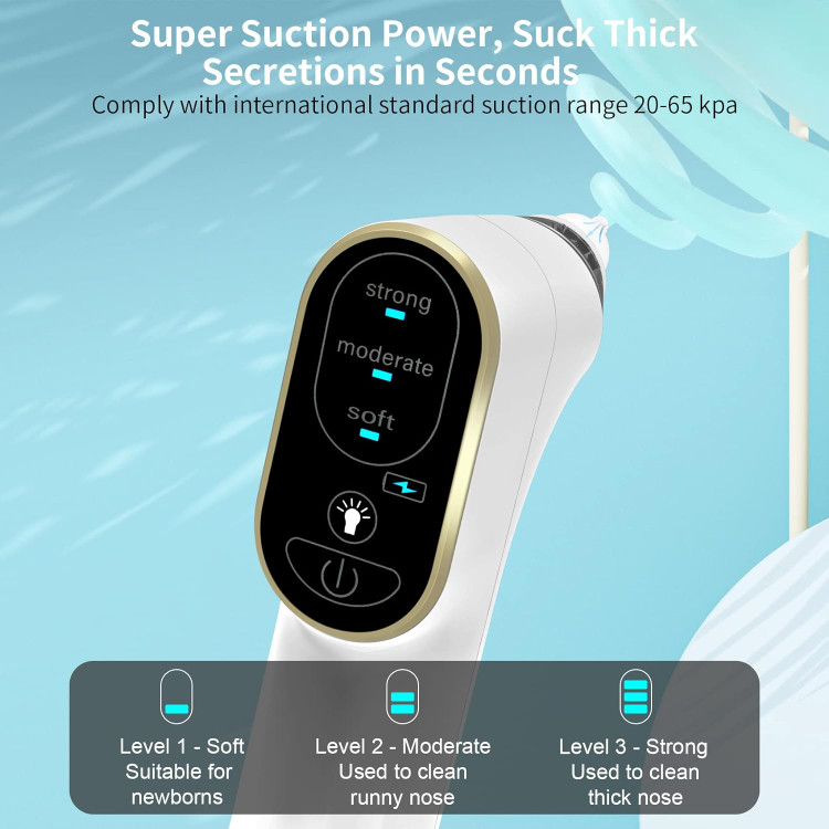 ] مکش قوی[ مکش آسپیراتور بینی نوزاد تا 65 کیلو پاسکال است. وجود دارد 3 حالت مکش را می توان تنظیم کرد، که می تواند تقریبا همه انواع snot را برطرف کند. (در مورد بوگرهای سرسخت و مخاطی، ابتدا با اسپری سالین اسنات نرم کنید، لطفاً 30 ثانیه تا یک دقیقه صبر کنید، سپس با مکنده بینی بچه Omoomo بمکید)